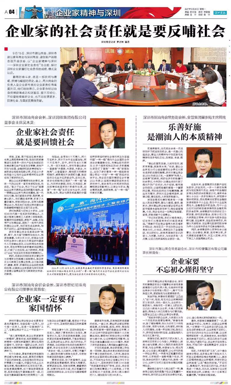 9月15日,深圳市潮汕商会、深圳市潮汕青年商会与深圳商报、读创客户端联合召开座谈会,以“企业家精神与深圳——深圳企业家社会责任”为主题,探讨深圳企业家履行社会责任的成绩、模式及认识。